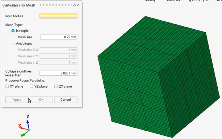 在Mesh模块下点击Hex Mesh进行六面体网格划分,这里有多种划分方式,选择适合模型的即可,这里我们选择了Cartesian Hex Mesh,网格尺寸设置为0.25mm。