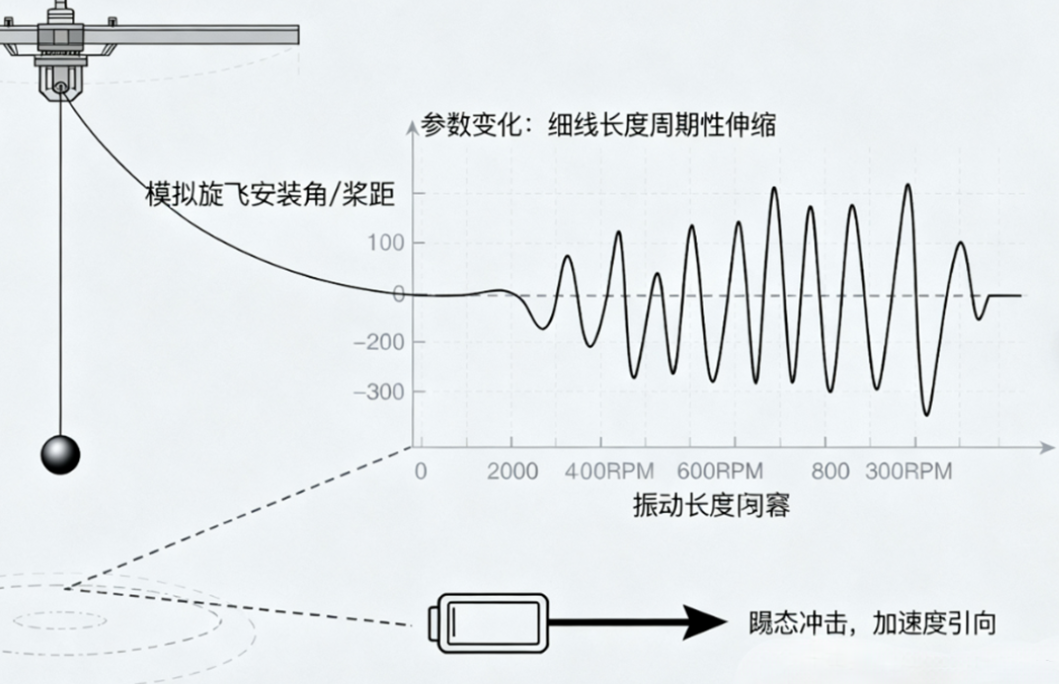 在倾转过程中,旋翼安装角、桨距等系统参数的动态变化会导致振动特性改变。例如,某型号eVTOL在垂直起降向巡航过渡时,转速从600RPM降至300RPM,气动载荷的周期性波动会引发参数激励。同时,电池系统在飞行阶段切换时承受的瞬态冲击也属于参数振动范畴。
