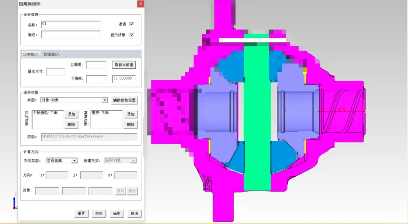 3DCC则通过三维模型直接识别齿轮啮合关系,自动建立侧隙尺寸链,并运用仿真法计算分布区间与合格率。系统能精确指出影响侧隙稳定性的关键尺寸,指导设计人员在垫片厚度或结构参数上进行优化,从而提升一次装配合格率与整机NVH表现。