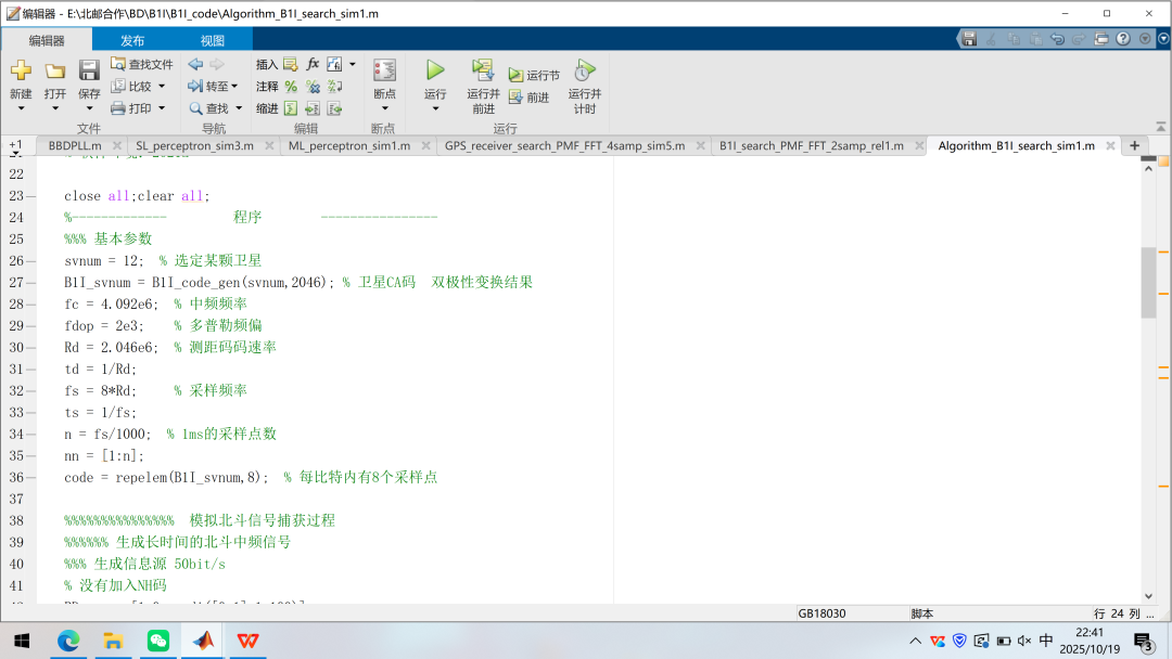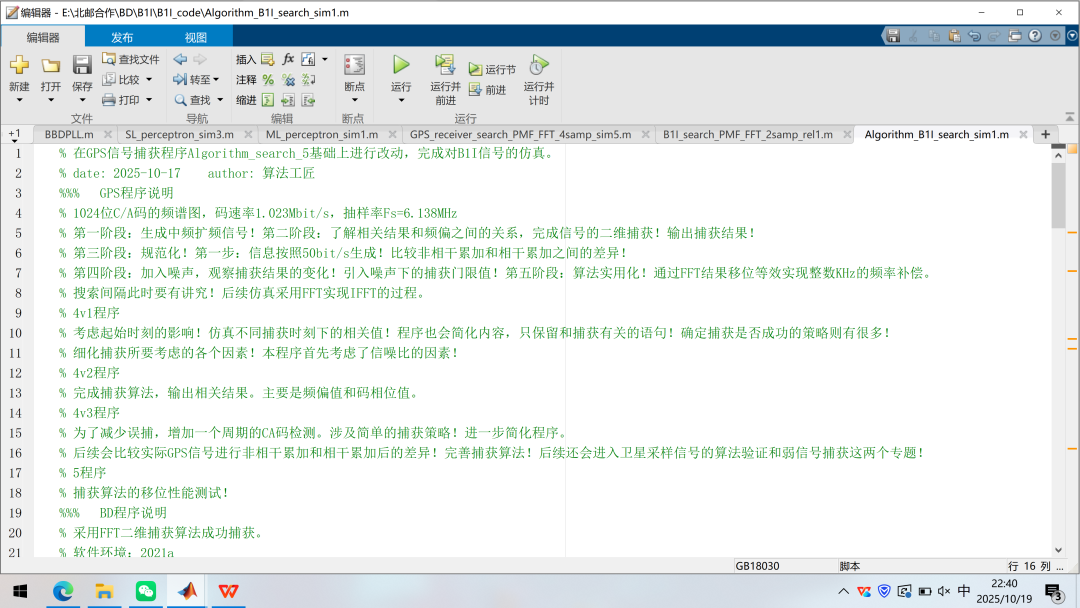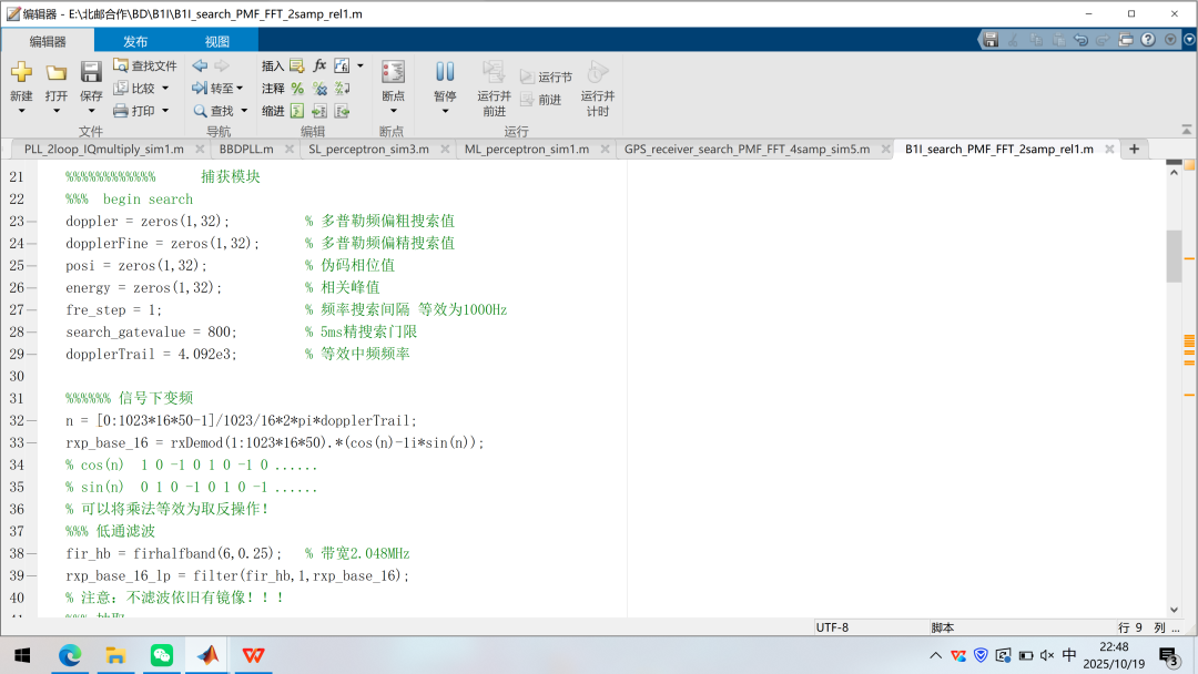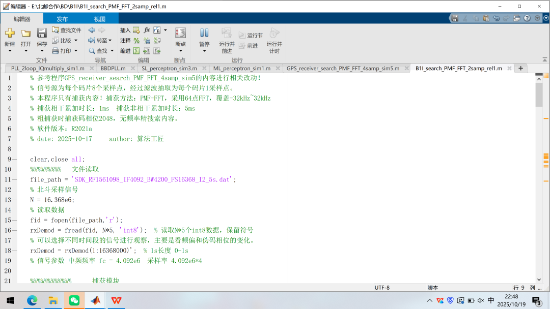 上一篇文章已经仿真出中频形式的B1I信号,采样率16.368MHz,中频4.092MHz,实信号仿真形式,同时也给出了捕获算法。大家吃透了程序中的捕获算法了吗?之前没有在信号中加入NH码,因此传统的二维捕获算法依旧适用。我这里有真实的采样信号(感谢北邮的李教授和北理工的杨博士提供的数据源),里面含有NH码,直接用PMF-FFT算法对真实采样信号进行测试,看看效果!本文依旧延续之前的写作风格,先看代码,再讲解!最近休息的比较好,吃的方面也有专人照顾,精力恢复的很多,那就趁着精力好趁热打铁,且行且珍惜!2025年10月24日,杨振宁院士的遗体告别日,过了今日,杨老不再留存人间,只往天堂,精神永存!吾辈更应奋发图强,虽有惭愧,但先辈精神之激励永难忘,赶紧开搞技术。先简单看一下之前的程序。