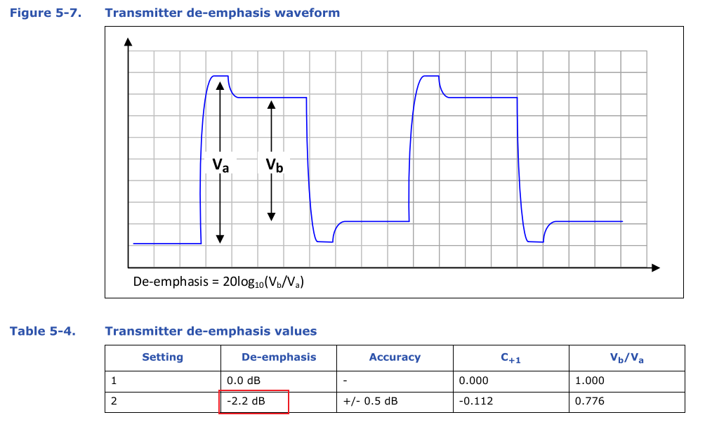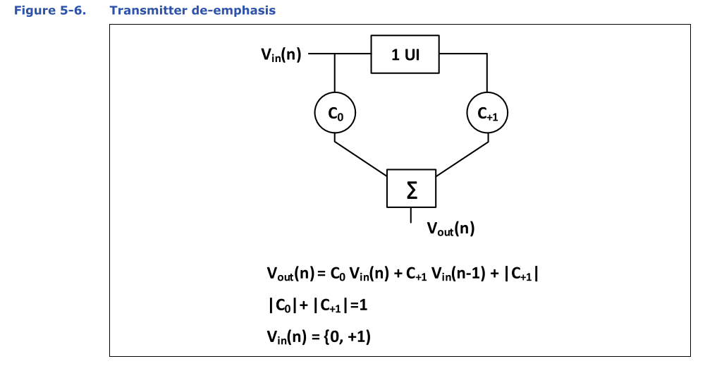 在16 GT/s的数据速率下建议使用发射机均衡,并且必须在24 GT/s和32 GT/s的数据速率下支持发射机均衡,以减轻信道ISI影响。Tx均衡仅对所有适用的数据速率进行去加重。24 GT/s和32 GT/s的Tx均衡系数基于图5-6所示的FIR滤波器。均衡系数受最大单位摆幅约束。发送器必须支持表5-4中所示的均衡设置。去加重设置的确定是基于初始配置或训练序列,其中将选择具有较大眼图张开度的值。
