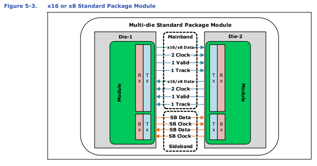 x16或x8“标准封装模块”采用传统的标准封装,间距更大。标准封装模块由一对时钟、16或8个单端数据通道、每个方向(发送和接收)的数据有效通道和跟踪通道组成。有一个低速边带总线用于初始化、链路训练和配置读/写。