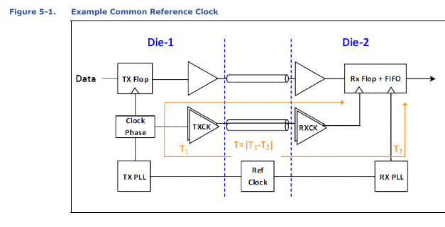 公共参考时钟(REFCLK)使用单个源分配给发射器和接收器。时钟可以由封装引脚提供,也可以由封装上的另一个芯片转发。在任一情况下,同一链路上的两个裸片所使用的参考时钟必须来自同一时钟源。尽管可以使用其他参考时钟,但建议每个小芯片使用100 MHz参考时钟,包括具有来自同一时钟源的不同参考时钟值的两个芯片。