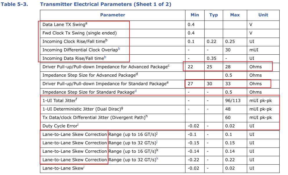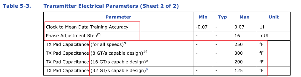 下图定义了TX摆幅,Slew rate,驱动阻抗,Jitter、SKew、寄生和Traning精度要求。
