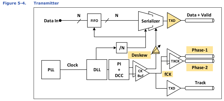 TX拓扑如图5-4所示。每个数据模块由N个单端数据发送器和一个有效信号组成。对于x64高级封装模块,N为68(64数据+ 4冗余数据)。对于x32高级封装模块,N为34(32数据+ 2冗余数据)。对于x16标准封装模块,N为16。对于x8标准封装模块,N为8。每个模块中有一对用于计时的发射器和一个Track信号。时钟频率和相位将在5.5节中详细讨论。