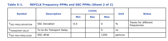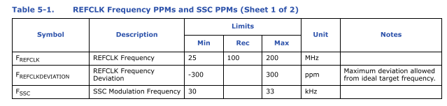 表5-1列出了允许的参考时钟频率范围。表中列出的最小和最大频率表示限制,并不表示支持整个频率范围的要求。实现需要为使用参考时钟的受支持数据速率生成精确的I/O时钟频率。请注意,如果I/O时钟频率是参考时钟频率的整数倍(如果不同于100 MHz),则可能出现这种情况。参考时钟可以在低功率状态下被禁用(诸如在其他标准和规范中所做的)。