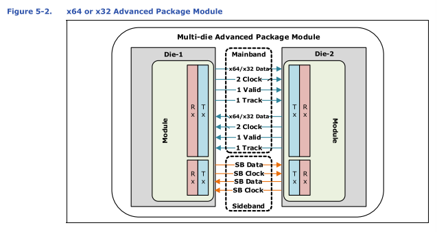 UCIe PHY的高级框图如图5-2和图5-3所示。UCIe物理接口由称为模块()Modules)的构建块组成。使用先进封装技术的模块(例如,EMIB,CoWoS)称为“高级封装模块”,由一对时钟、分别用于x64或x32高级封装模块的64或32个单端数据通道、每个方向(发送和接收)的数据有效通道和跟踪通道组成。
