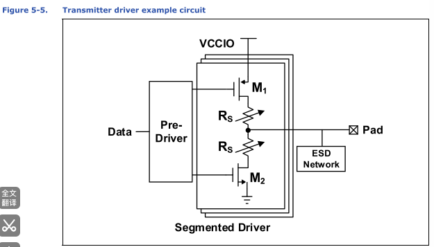 发射机经过优化,操作简单,功耗低。图5-5显示了一个低功率发射机驱动器的例子。允许单独的上拉和下拉强度,以在不同的通道配置中实现最佳性能。建议使用控制回路或培训来调整输出阻抗,以补偿工艺、电压和温度变化。控制回路和培训是特定于实施的,超出了本规范的范围。在低功耗状态下,实现必须能够三态输出。建议优化ESD网络,以最大限度地减少焊盘电容。在更高的数据速率下可能需要诸如T-coil的Inductive peaking technique。