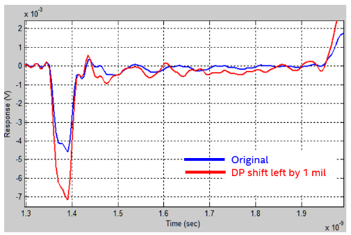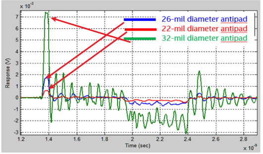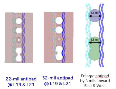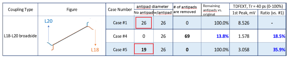 26mil改为22mil,串扰由1.9mV变为0.6mV(68% reduction);32 mil antipad, xtalk => 1.9 mV to 7.4 mV (~300% increase)