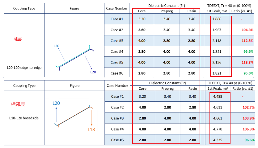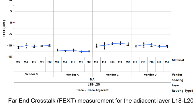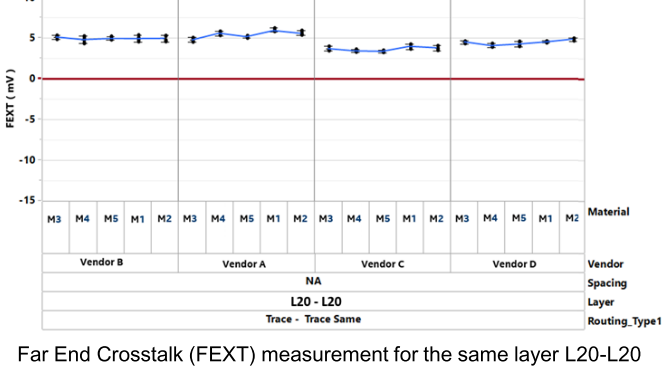 分析采用22L PCB,4mil core 5mil PP,用五种不同的ultra-low loss材料,让四个不同的PCB制造商加工;对比远端串扰情况。