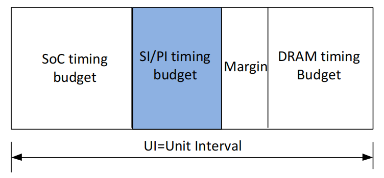 下图描述了LPDDR4X通道的系统时序预算。总数据位UI(单位间隔)被划分为三个主要部分,即SoC时序预算、DRAM时序预算和SI/PI时序预算(这些部分以蓝色显示)。剩余的部分即为时序余量。