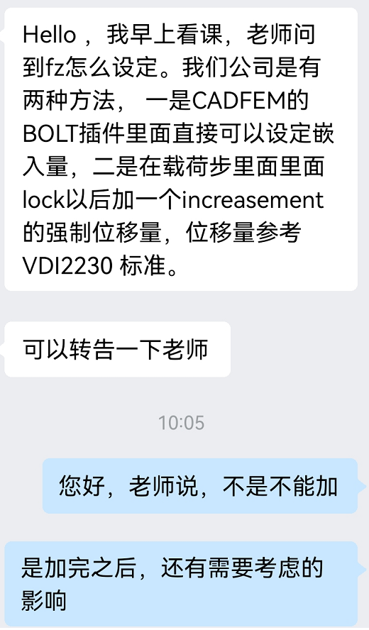 第二,该学员愿意根据自己的经验帮我们改进。规范提供了两种考虑嵌入方式,我们在课程中推荐大家直接施加损失后的预紧力。该学员提出他们的做法,对我们是很好的补充。