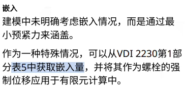 在仿真中,有两种方式考虑嵌入。第一种,直接施加考虑嵌入损失之后的预紧力;第二种,先施加完整的预紧力,再考虑嵌入量带来的损失。