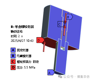 第一个载荷步在螺杆中施加预紧力,第二个载荷步在活塞底部施加压力。