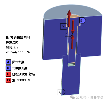第一个载荷步在螺杆中施加预紧力,第二个载荷步在螺栓头支承面施加拉力。