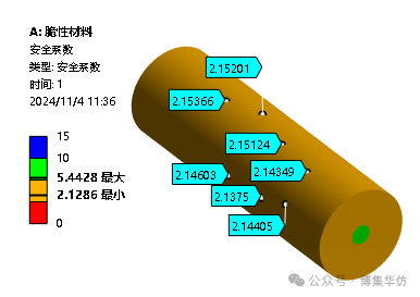 直接获得外表面的莫尔应力安全系数约为:2.15