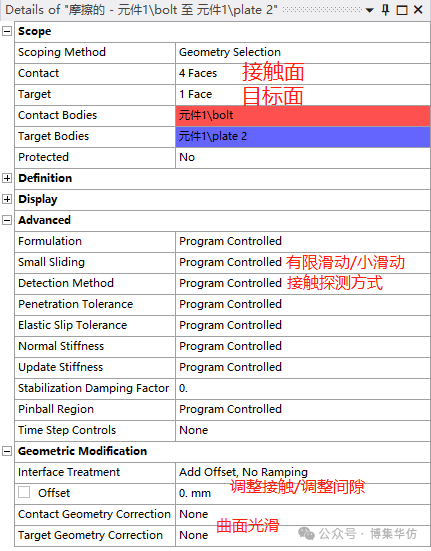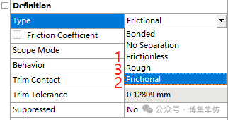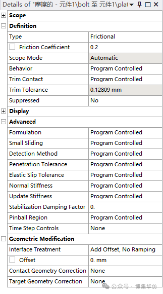 在ANSYS中,所有的接触属性通过Details定义:
