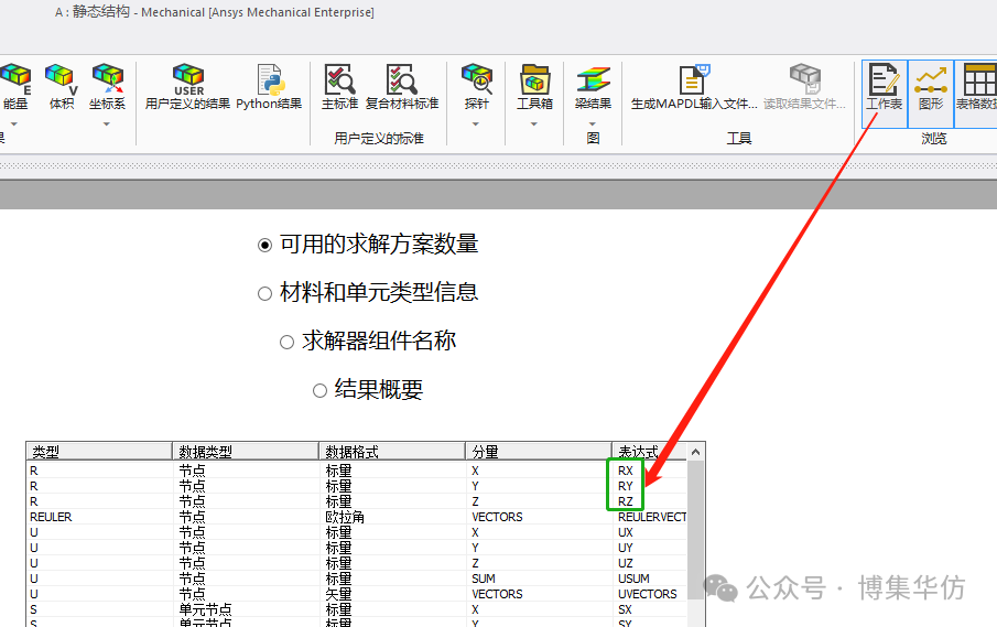 单击工作表,RX,RY,RZ为节点的转角结果。