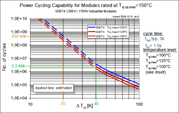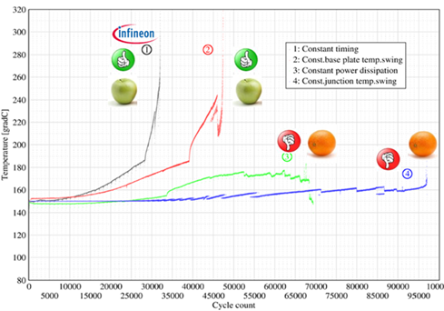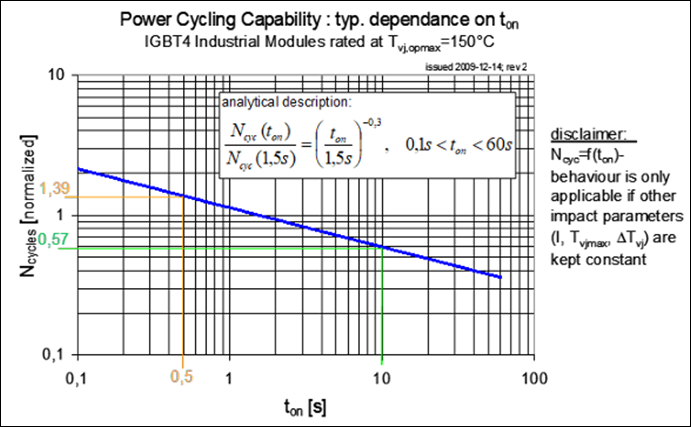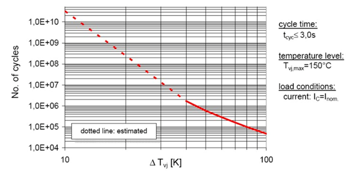 英飞凌研究指出:在 t_on = 1.5s 的条件下,模块寿命远低于 t_on = 几十毫秒 的场景,原因正是应力机制从 “弹性” 转为 “塑性”。