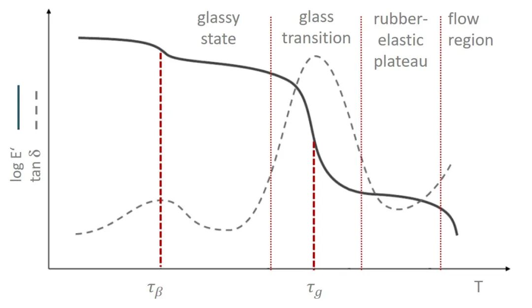 使用 DMA 设备,可以根据包含温度梯度的测试规范测定热转变温度。这些转变温度对于聚合物尤其重要,因为它们的刚度在特定温度下会发生显著变化。为了针对特定应用选择合适的材料,了解聚合物的温度相关材料行为至关重要。图 5 显示了典型非晶态热塑性聚合物的温度依赖性行为。