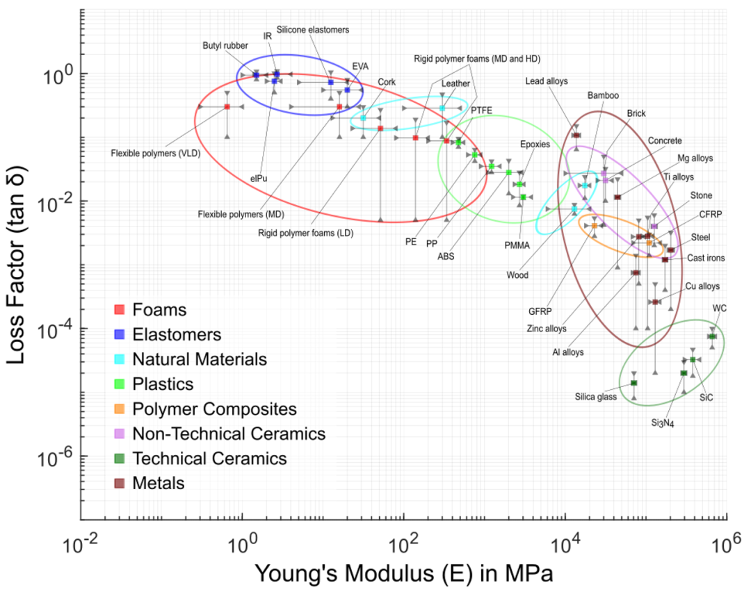 上图这些材料涵盖不同的材料类别,例如金属、陶瓷材料、塑料等。例如,该图显示,工业陶瓷的模量非常高,但几乎没有阻尼能力。对于需要兼具高抗变形能力和中等阻尼能力的应用,金属材料或聚合物复合材料更适合,如图所示。相反,如果良好的阻尼性能在应用中至关重要,但机械承载能力却可以忽略不计,那么聚合物泡沫材料则是正确的选择。