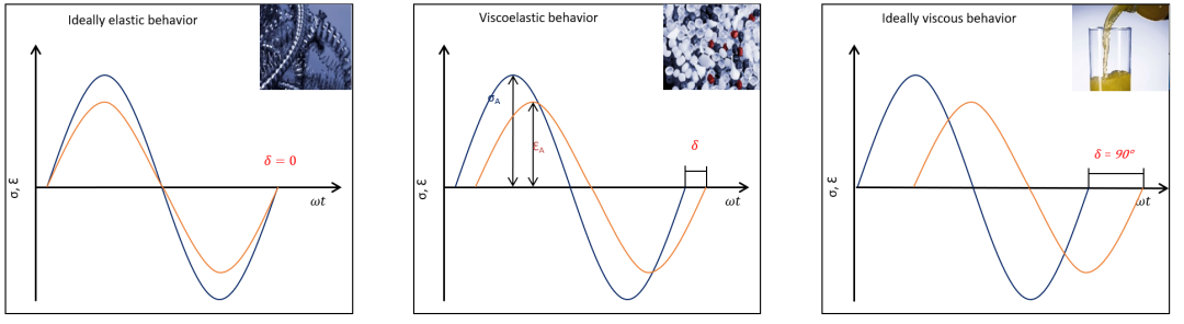 待测材料样品受到一定的正弦应力或应变(轴向或扭转变形)作用,并测量其反应(图 1)。理想弹性材料会立即做出反应,没有任何延迟,正弦应力和应变曲线没有相移,因此δ为零。理想粘性材料的应力和应变曲线显示相移角δ = 90°。正如“粘弹性”一词所暗示的,粘弹性材料的行为是两者的混合。因此,相移角为 0° < δ < 90°。