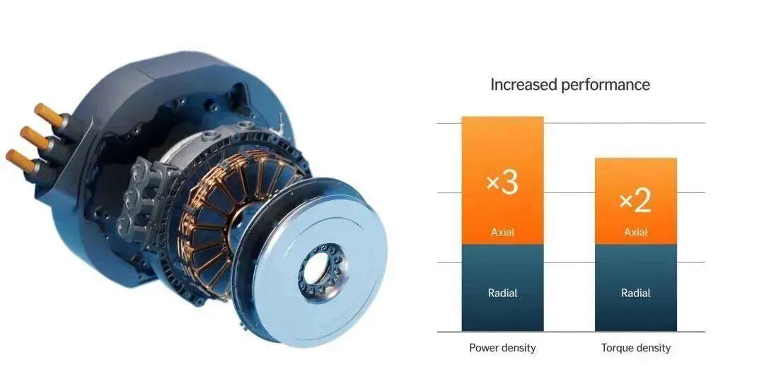 值得注意的是,轴向磁通电机的功率密度优势不仅体现在数值上,更重要的是其独特的转矩 - 直径关系。根据电磁原理分析,径向磁通电机的转矩与电机直径的平方成正比(T∝r²),而轴向磁通电机的转矩与直径的三次方成正比(T∝r³)。这意味着在相同的材料使用量下,轴向磁通电机可以产生更大的转矩输出。