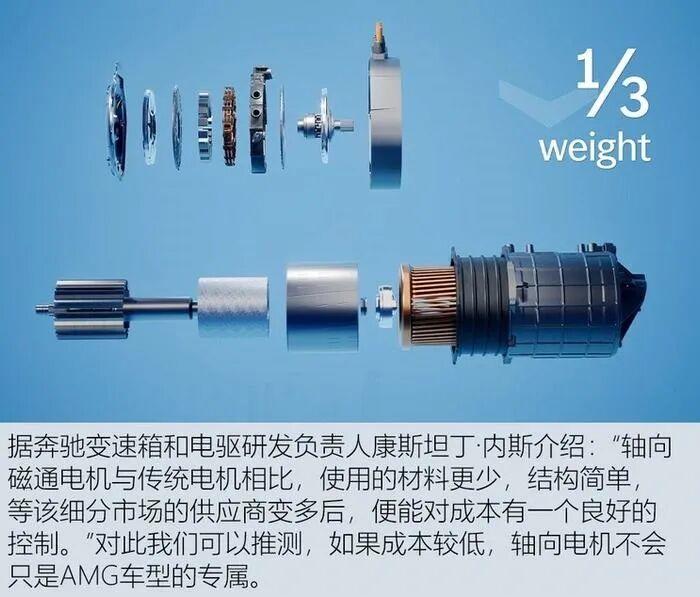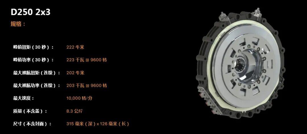 YASA 公司的 750 系列双转子单定子轴向磁通电机代表了当前技术的最高水平,其最大功率 380kW,峰值扭矩 590N・m,而重量仅为 26kg,功率密度达到 14.6kW/kg。该公司被梅赛德斯 - 奔驰收购后,专注于高端汽车市场,在电动超跑电机领域市占率达 40%。