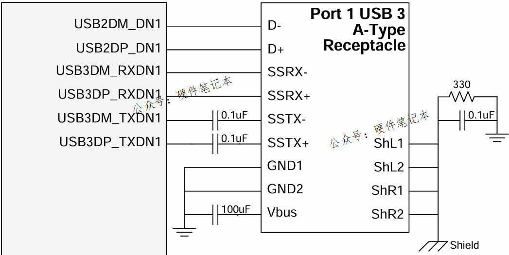 USB3.0:除了保留D+/D-外,新增SSRX和SSTX两对差分线