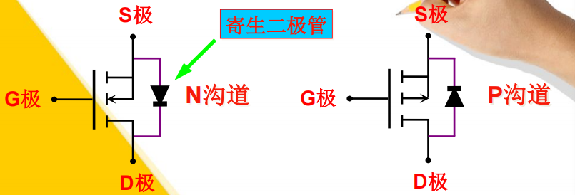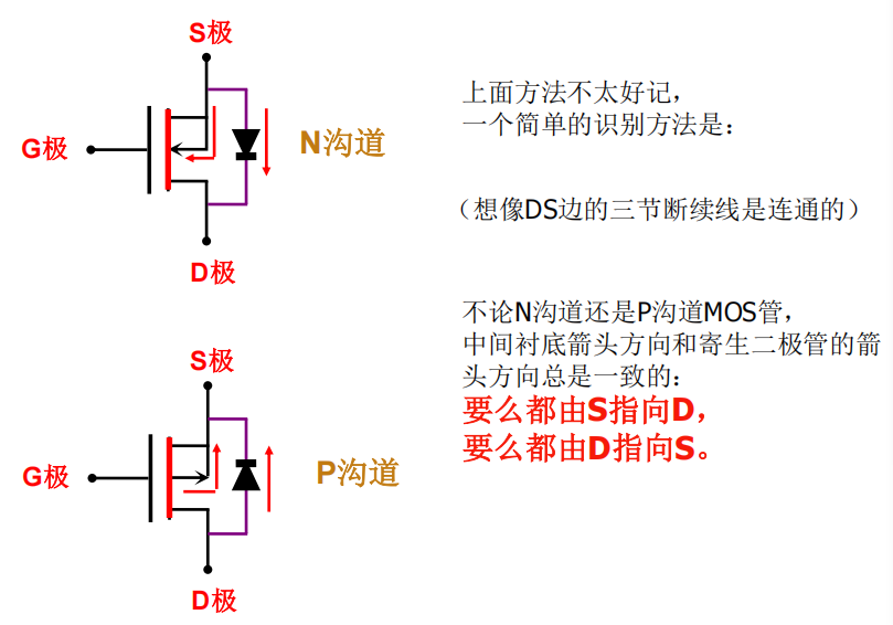 沟道类型:箭头指向G是N沟道,背向G是P沟道,寄生二极管方向跟着走,别搞反!
