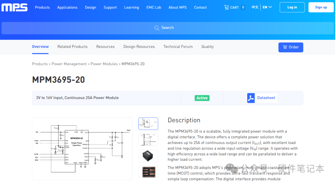 为了验证MPM3695GPJ-20的实际表现,我通过MPS官网申请了评估板 EVM3695-20-PJ-00A,也找到了他们的工作人员,并拿到了配套的10页规格书。