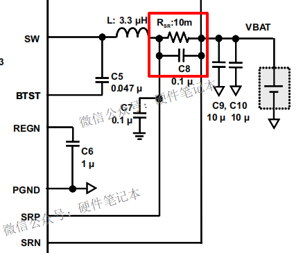 RSR为一个10mΩ充电电流检测电阻,可实时监测充电电流的工作状态。电容C8为0.1uF的陶瓷电容,用来消除差模滤波。