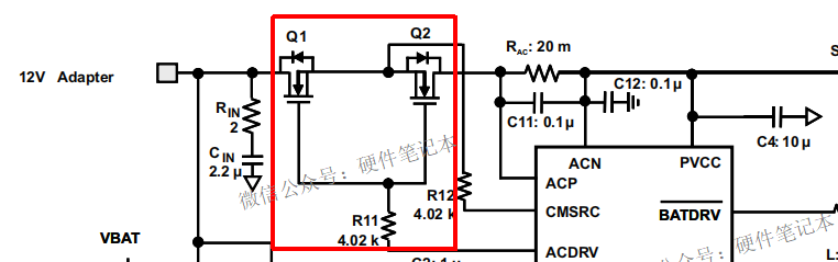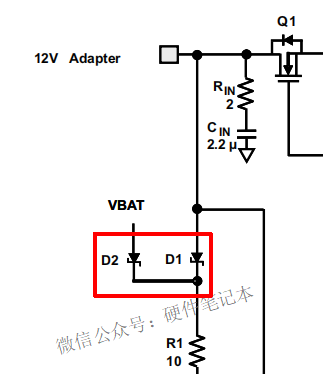 D1, D2是用来选择供电电源的,D1表示由输入适配器给芯片VCC供电,D2表示由电池给芯片VCC供电。