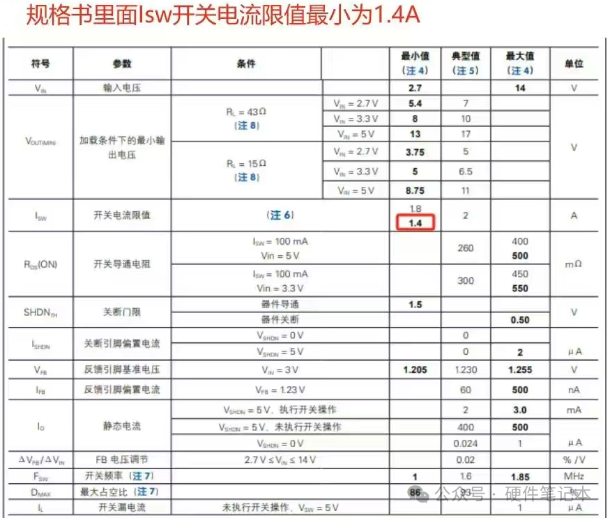 我选了一颗芯片,规格书写的Isw开关限制电流为1.4A,那我带载0.2A肯定绰绰有余了。