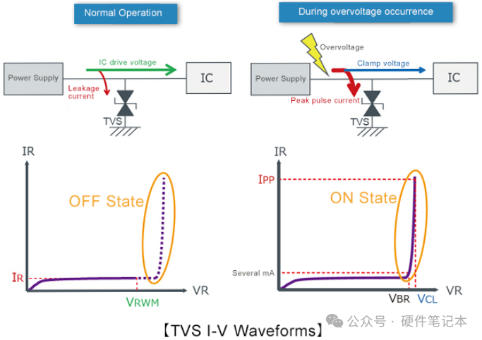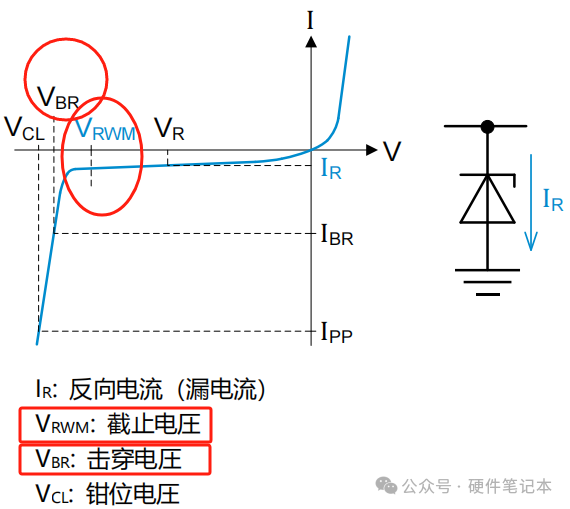 VBR是breakdown(击穿)电压,指TVS的最大额定电压,超过此电压,TVS会击穿,电流会急剧增加,以保护电路内部元器件。