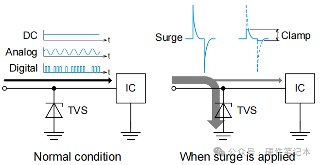 右图显示了施加浪涌时的操作。如果浪涌电压超过TVS二极管的击穿电压,浪涌电流将通过TVS二极管,大部分电流流向地。随后,TVS二极管箱位电压,保护后续电路中的器件。