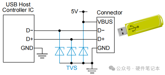 静电通过USB、HDMI和其它通常安装在电子设备上的连接器进入。下图为一个USB连接器的例子。由于人体会接触电缆和USB设备,因此容易受到静电的影响。TVS二极管被放置在连接器和集成电路之间,以防止静电放电的进入。
