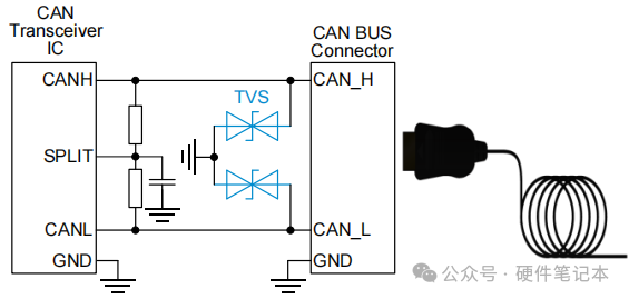 如果连接设备的网线被带电的人体或物体接触,ESD就会通过网线进入电子设备。下图展示了一个汽车控制器局域网(CAN)的例子。TVS二极管安装在网络电缆与待连接设备的IC之间,以防止ESD进入。