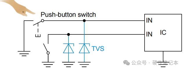 安装在电子设备上的开关和按钮在操作时会接触到人体,静电放电(ESD)可能会损坏集成电路或导致故障。为了防止这种损坏和故障,在开关与待保护设备(此处为集成电路)之间放置TVS二极管,以防止静电放电进入。