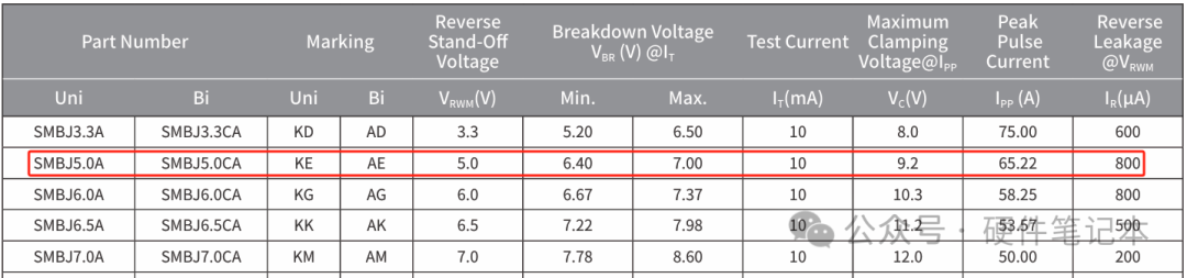 咱们来打开一份规格书,以SMBJ5.0A为例,主要参数包括: