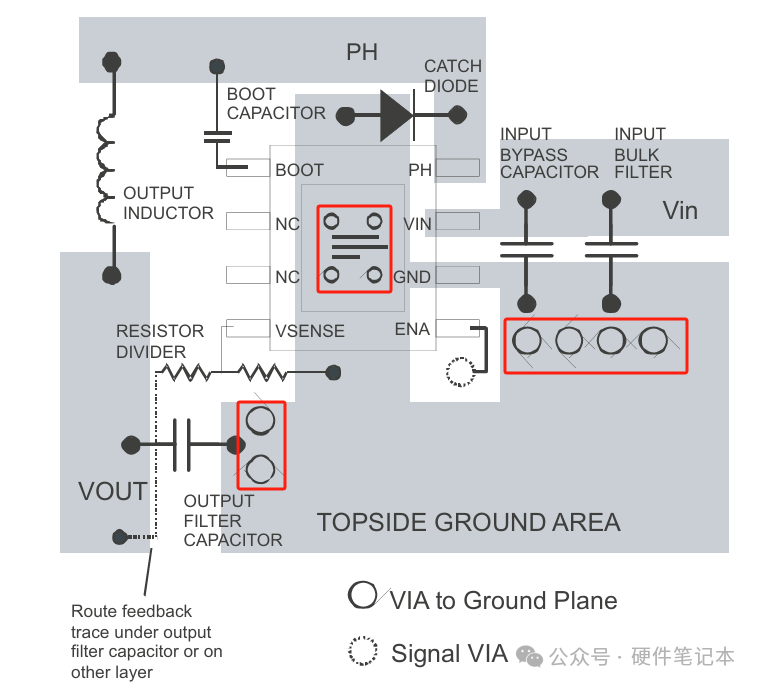 小小的过孔看起来不起眼,实则很有讲究,新手最容易翻车。之前,一个新同事在画DC/DC电源的时候,因为过孔没打好,板子回来调试发现电源带不起载,后来只有重新画板,如下是更新后的PCB图,一个12V转5V的DC/DC电源。