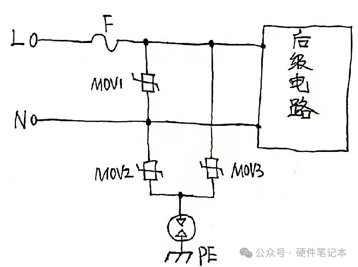 简单画个示意图,在L-N之间串联一个压敏电阻,L-PE或N-PE串一个压敏电阻和气体放电管,如下图所示。