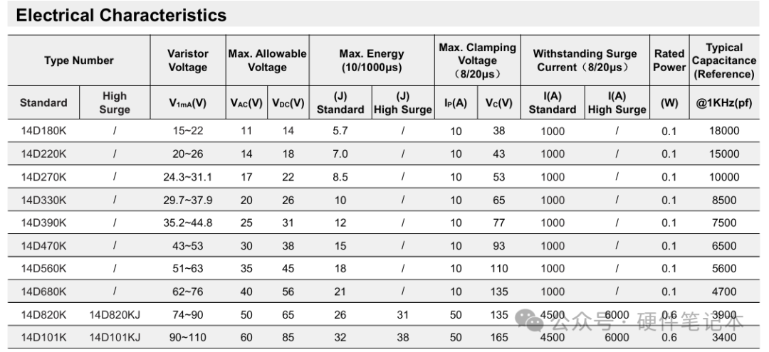 打开一份压敏电阻的规格书,我们来看一下它的主要参数: