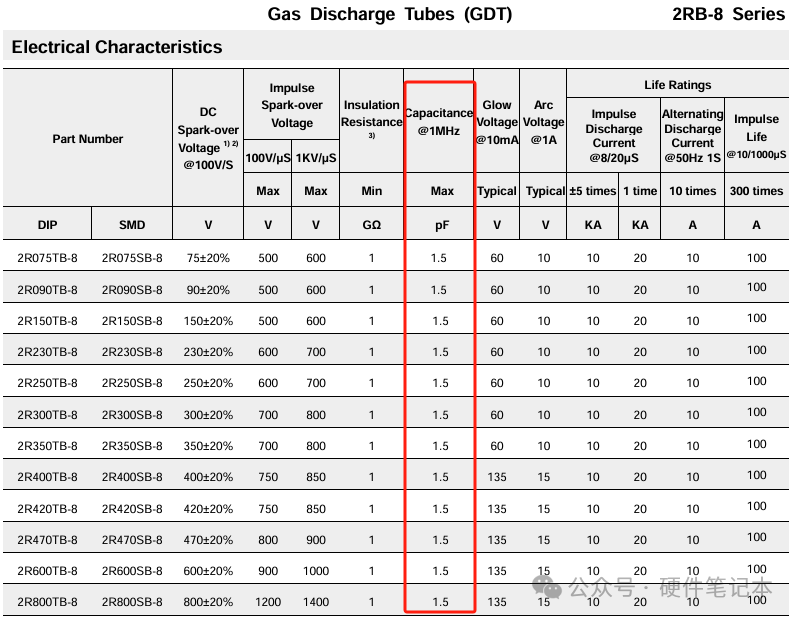 气体放电管的寄生电容小,打开一个规格书,可以看到放电管电极间电容只有1.5pF,一般在2~10pF,寄生电容小,可以更快地响应高频暂态过电压和过电流,有效地保护后级电路。