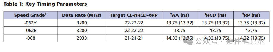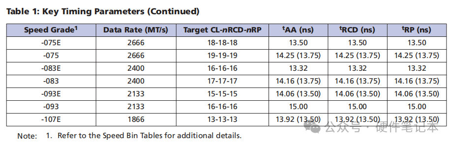 例如,速度为2666 MT/s的内存模块在速度等级-075E下的时序参数为18-18-18,对应的访问时间、行地址到列地址延迟和行预充电时间均为13.50纳秒。