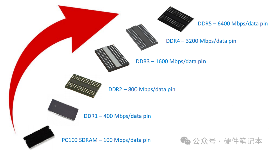 DDR的版本迭代经历过SDRAM、DDR1、DDR2、DDR3、DDR4和DDR5,预计DDR6将在2026年上市。