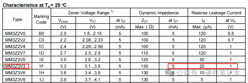 电路中稳压二极管的型号是MM3Z3V3,参数如下,当反向电压为1V时,漏电流为20uA。