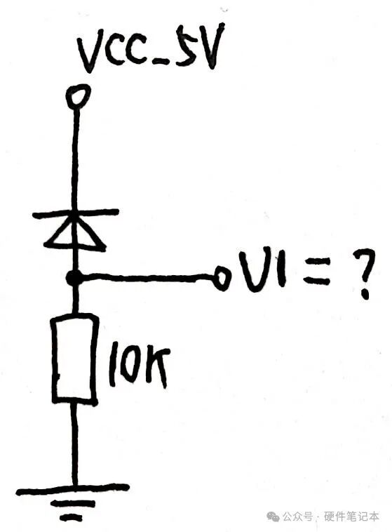 然后统计了两组数据,对比稳压管拆解前后的电压,具体数据如下表:采样的电压是不断波动的,当输入12V时,ADC电压误差还不是很大,仅仅相差0.012V,当时输入电压达到24V时,电压差值就达到了0.4V。 当我看到问题的第一反应就很熟悉,基本就知道了原因,因为我也遇到过类似的问题这个稳压管的主要作用是用来保护单片机的IO口,因为检测的电压是波动的,一旦波动太大,有可能超过单片机IO口的电压,一旦超过IO口能承受的电压,单片机就会损坏,所以加个稳压管可以起到保护的作用,而且加稳压管也是一种相对简单,便宜的方案。那为什么这个稳压管影响这么大呢?在回答这个问题之前,我们先来看看下面这个电路,请问大家图中电压V1是多少伏?基础一般的同学可能会说,因为二极管反向,没有电流流过,V1被10K拉低,所以V1=0V。他们可能忽略了二极管一个比较重要的参数,反向漏电流,所以其实V1是有电压的,二极管的漏电流越大,V1电压越高。