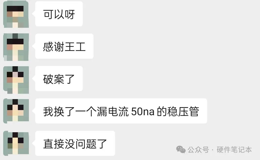 我们实际应用中更多的是更换稳压二极管,于是我让这位兄弟尝试更换一个漏电流更小的稳压二极管,果然就好了。