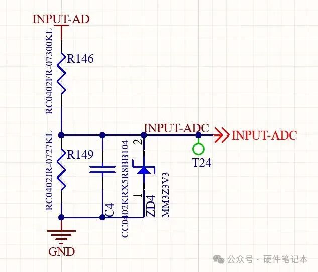 有兄弟给我发消息,问电路中这个稳压管是不是不能这么用?为了大家能够看的更清晰,咱们把电路图单独拎出来看。如图,为了检测INPUT_AD电压值,通过两个电阻R146和R149分压,然后将分得的电压值送到单片机的IO口,用单片机的ADC进行电压检测。